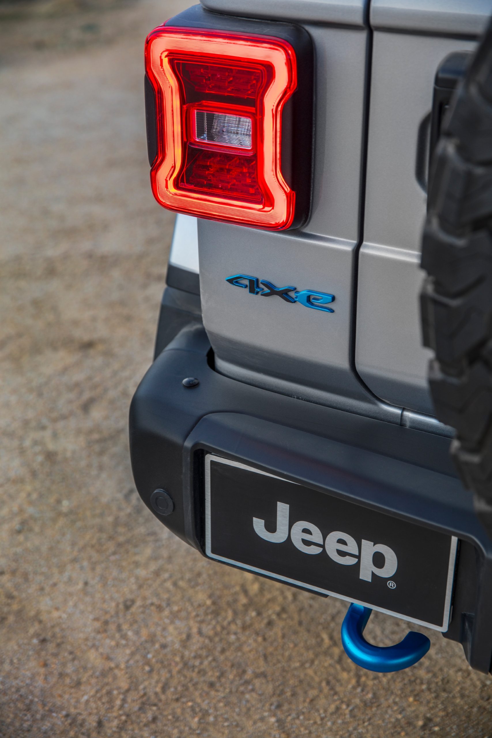 Surf Blue accents the 4xe badge and tow hooks on the 2021 Jeep®
